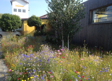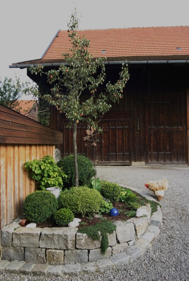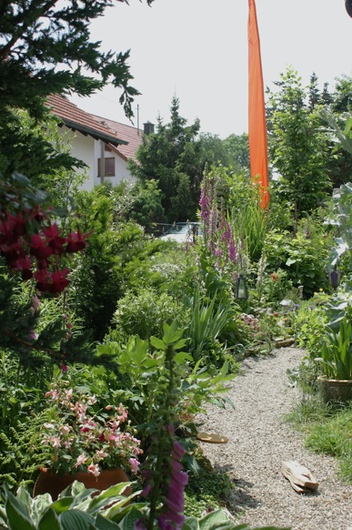 Steinbeete, üppige Staudenbeete und Hochbeete.